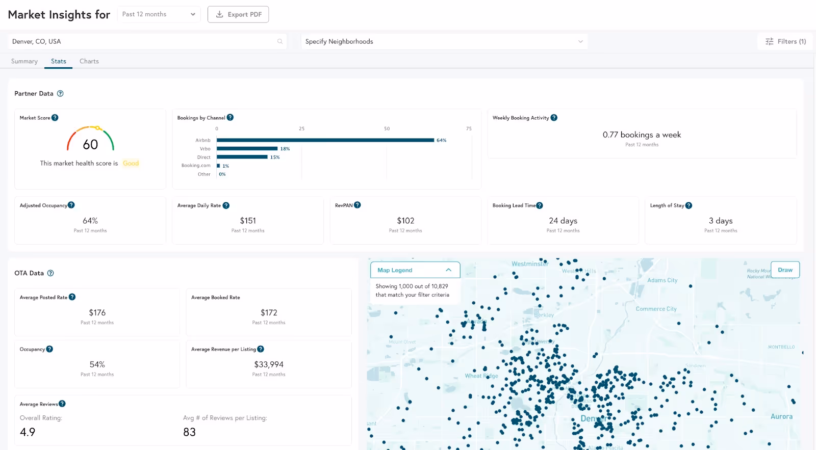 Its reports include benchmarks and seasonal trends, but do not include forward-looking booking pace or demonstrate how seasonality changes over time. Paired with its questionable data quality, the tool seems most useful for agents looking to sell properties to STR investors rather than the investors themselves.