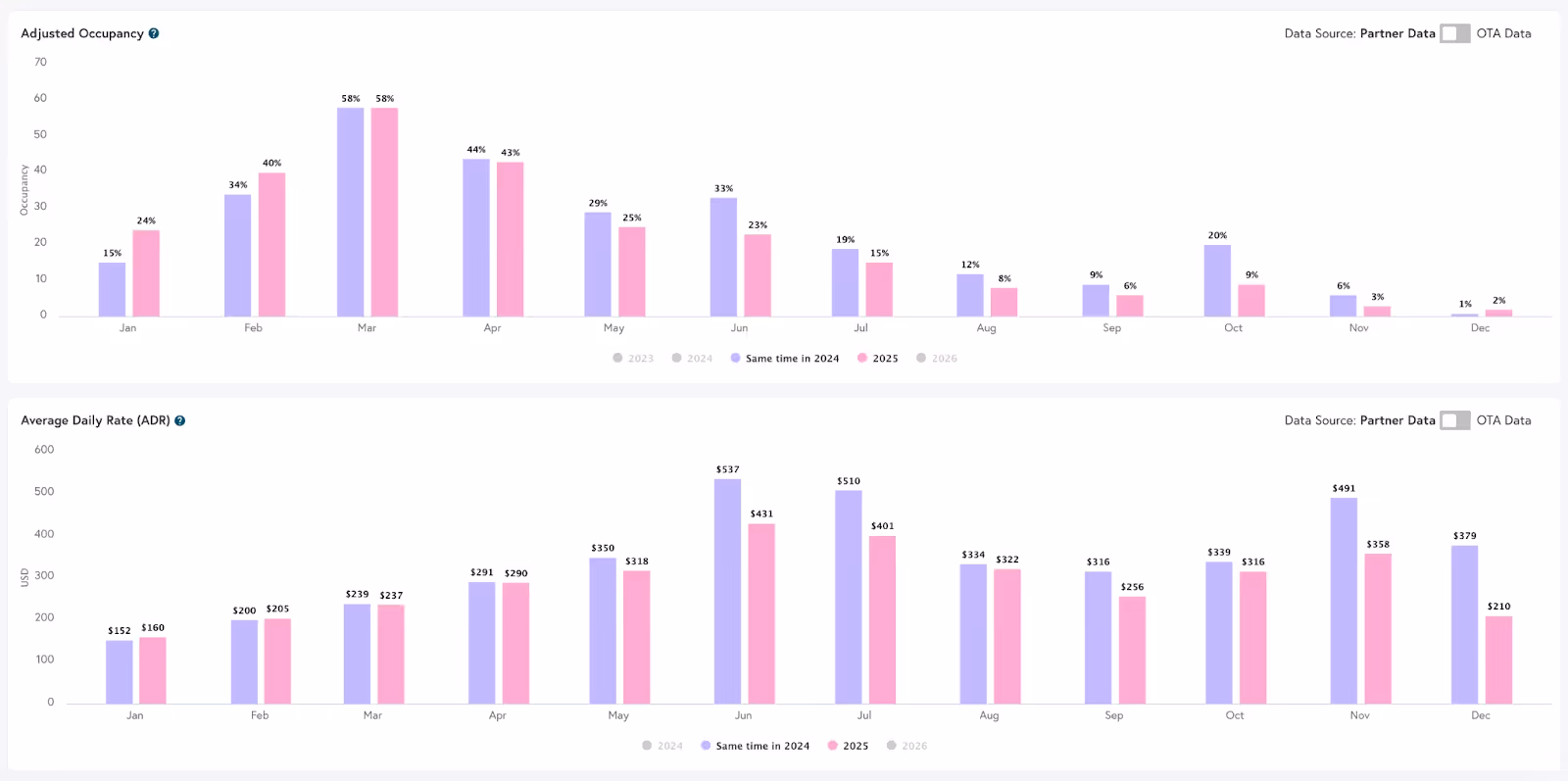 Its reporting also includes forward-looking booking pace, seasonal trends, and competitive benchmarks. Finally, users can toggle between views for different markets, track historical vs. projected performance, and download custom reports.