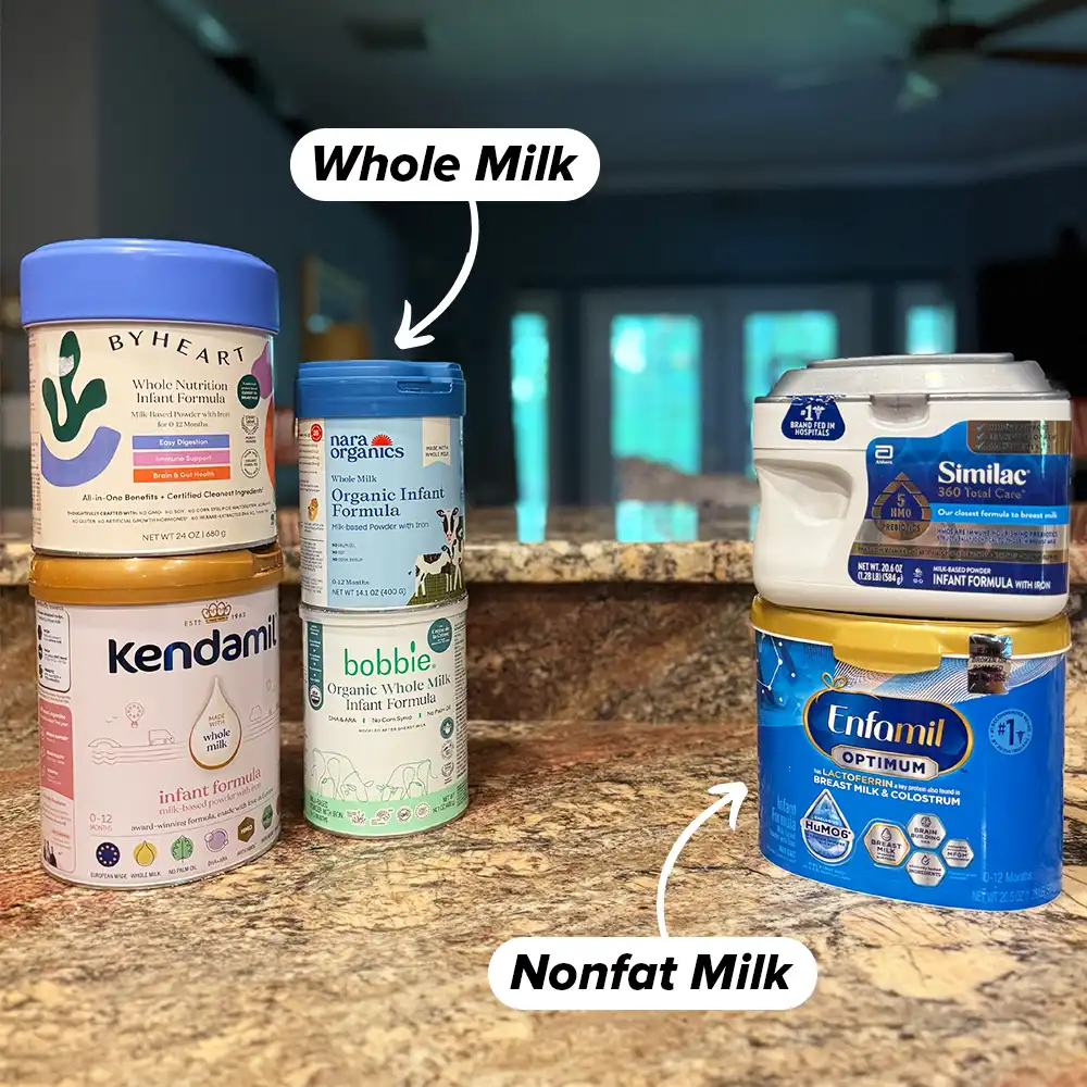 - An organic whole milk formula. “Most formulas start with a nonfat milk base and add vegetable oils to reach the required fat content,” Arsenault explains. Whole milk-based formulas contribute naturally-occurring fatty acids from milk fat, which means they include a lower volume of plant-based oils. Additionally, skim milk-based formulas typically do not contain MFGM, which has been studied for its role in brain development and immune health.2