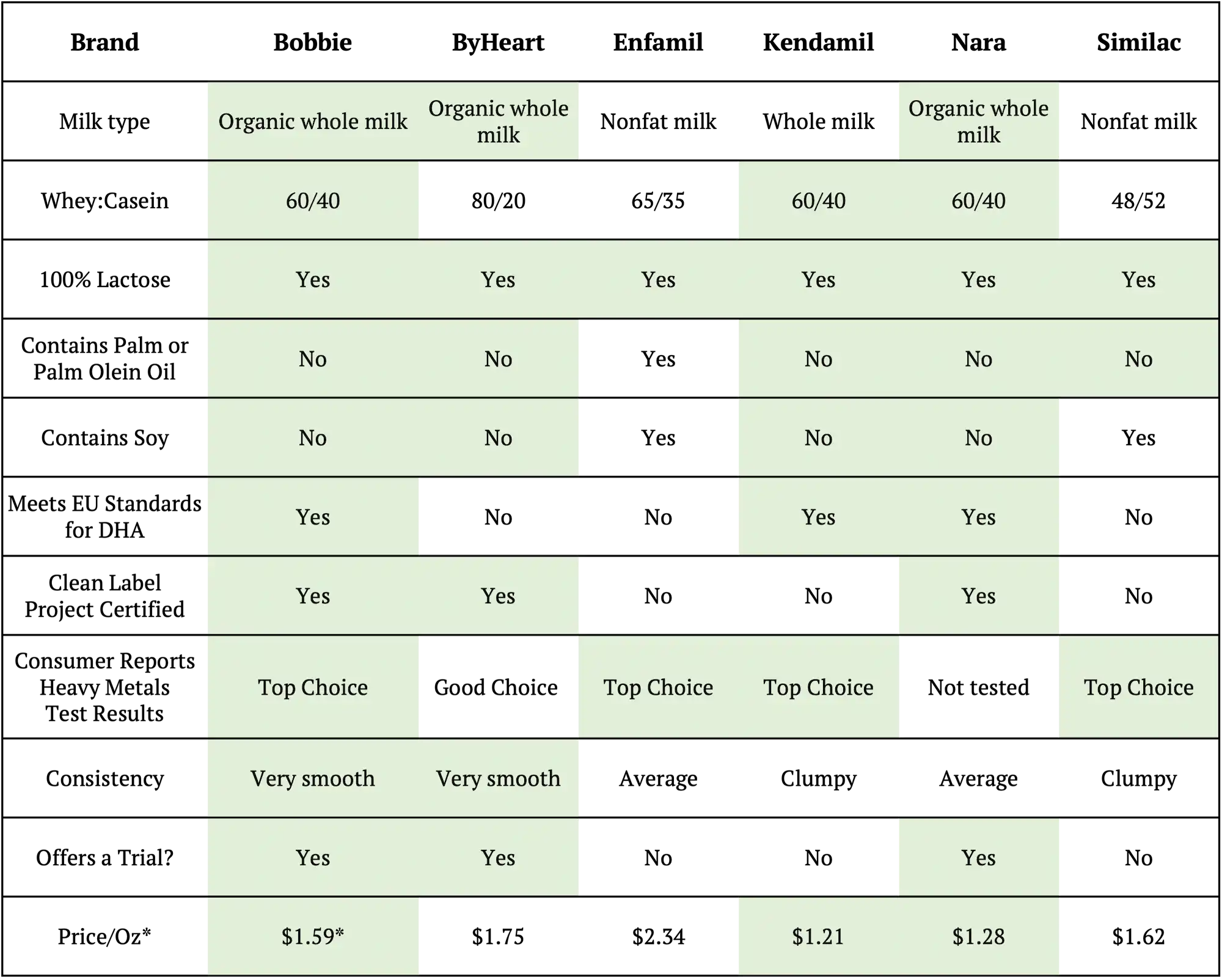 The most important decision? Choosing a formula that’s modeled after breast milk, is certified via third-party testing, is a good value, and is widely available. Let’s see how our six brands stack up.