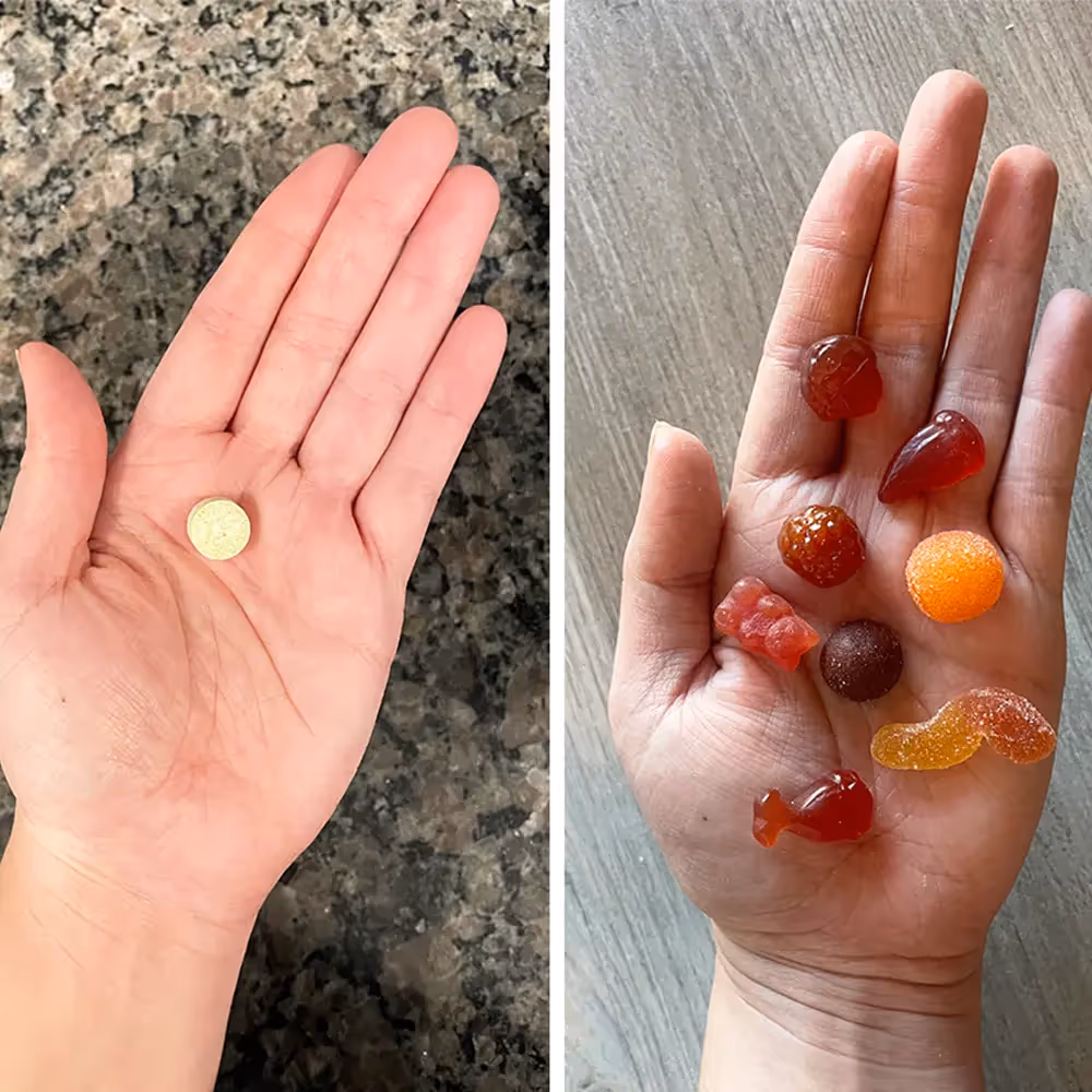 O’Connor always recommends tablets over gummies. Due to their manufacturing process, gummies can contain inconsistent levels of nutrients. Their form also prevents them from containing important minerals like calcium and iron.4