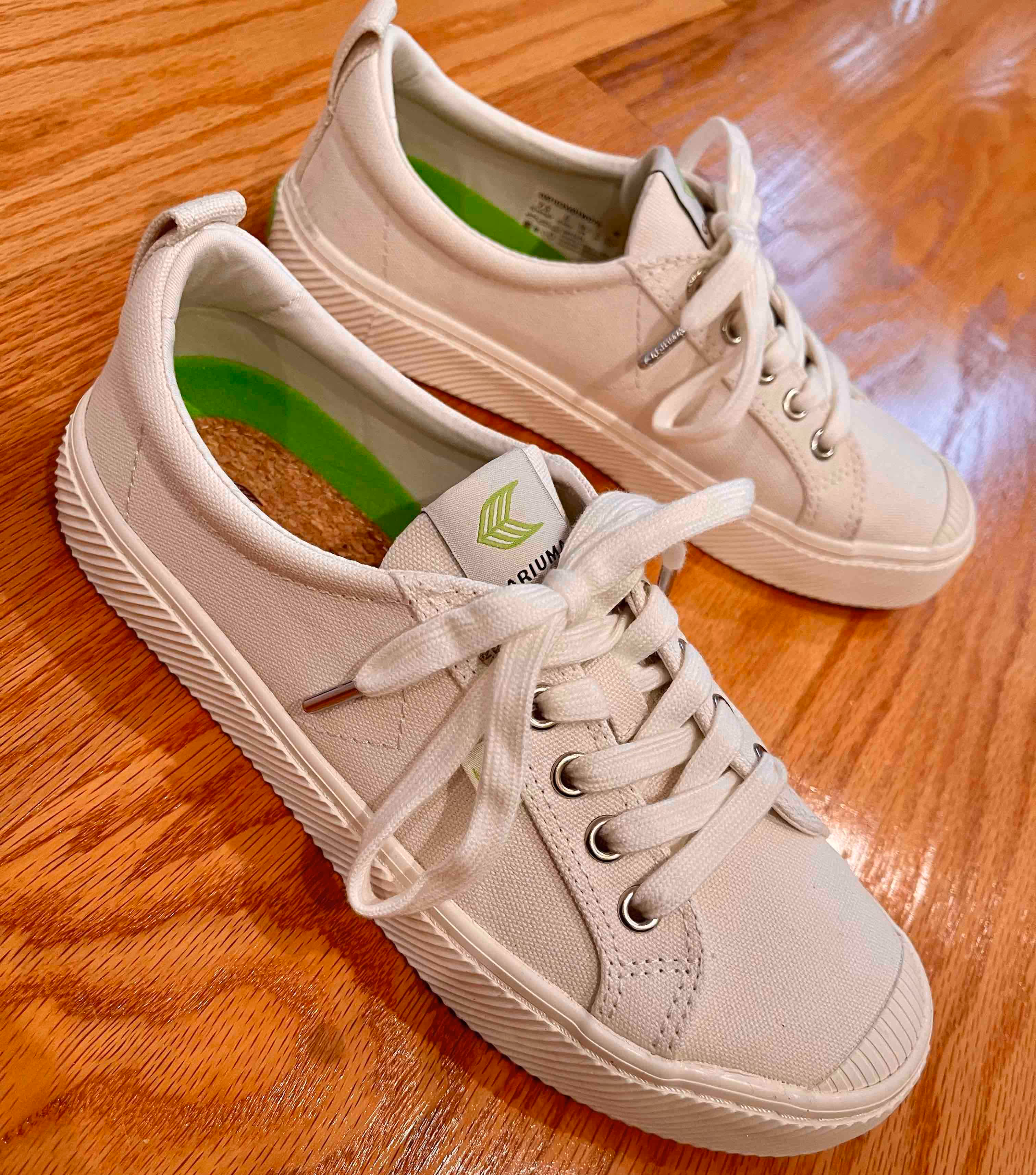 Another thing I love about my canvas OCA sneakers is their attention to detail. I’m not a fan of big stitching, but Cariuma’s outsole is delicately stitched and tasteful. Their laces have little metal caps that add style while protecting them from splitting. Their heels also have cute green logos stamped on them, another small touch that I’ve come to really enjoy.