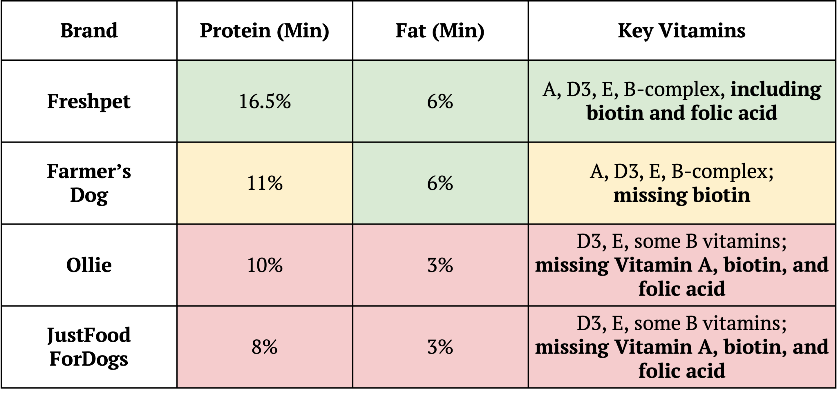 Only Freshpet includes optimal protein and fat levels along with high-quality carbs and a full vitamin panel - while the other brands lack in key nutrients and macros.