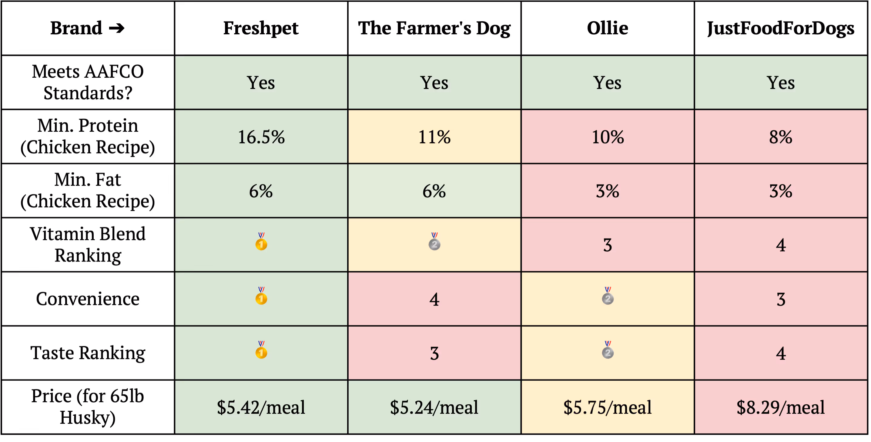 Sombra, our 5-year-old husky, has always been my running buddy. For years he kept up easily, but now he’s slowing down - less excitement to get out the door and calling it early. Even more alarming, we noticed he wasn’t as interested in food, and more specifically his “wild” kibble. That’s when we learned it’s actually common for aging dogs to lose appetite and energy - and that switching to fresh, less-processed food can help improve both1. We decided to give the leading fresh brands a try, to help you decide what’s best for you and your dog.