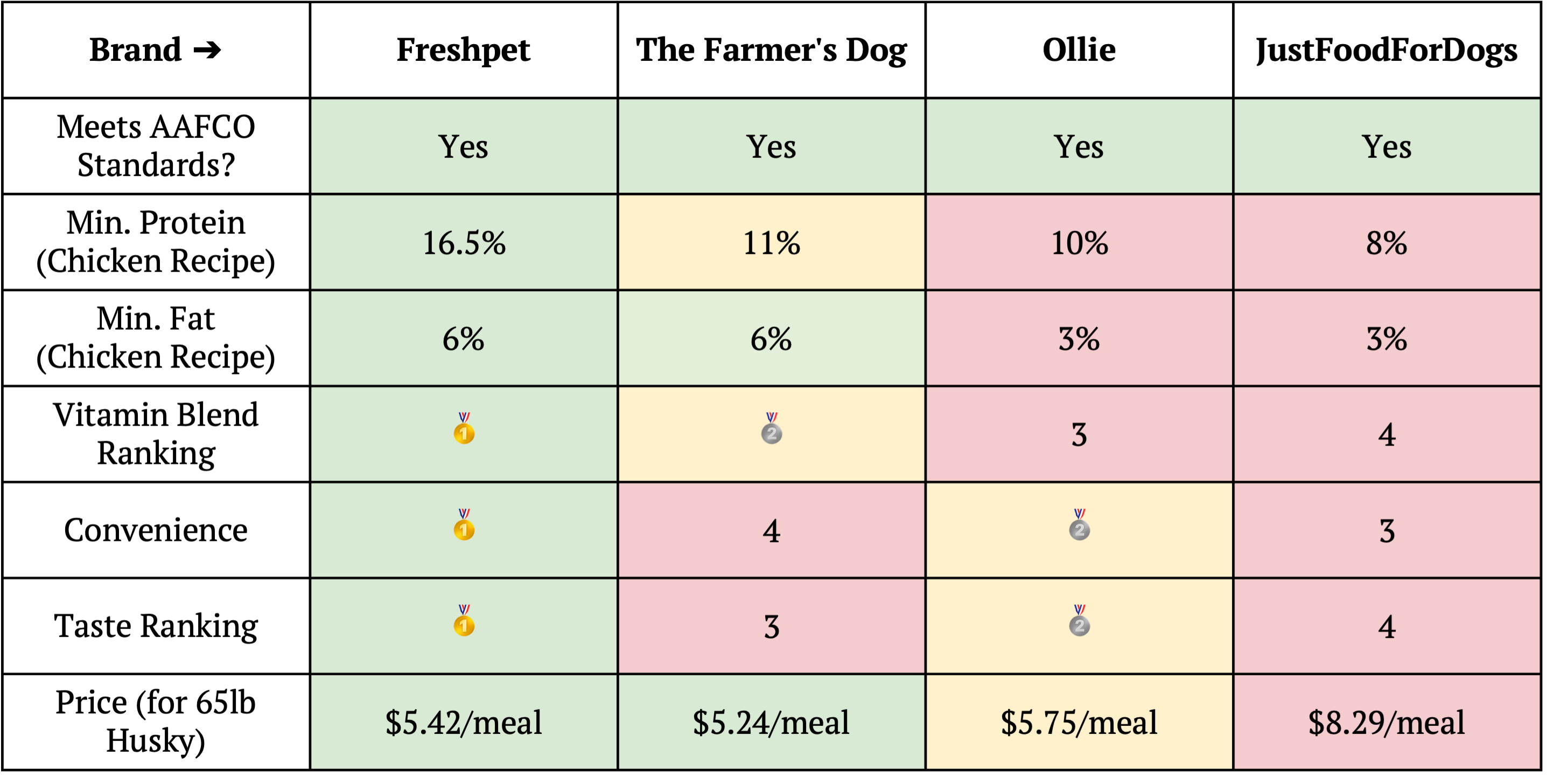 Freshpet’s has the highest protein level of the group, important for maintaining muscle mass which can degrade with age.5 It ties for highest fat content - the most important source of energy in a dog’s diet - and has the most comprehensive vitamin blend. Freshpet’s recipe also features oats, a high-quality carb with high levels of fiber, B vitamins, iron, and magnesium. That’s better than filler carbs like pasta that other brands, like JustFoodForDogs, contain. For Sombra, that translated into more energy after just a week on Freshpet, pulling harder on our runs and staying energetic at the park when he would usually start to fade.
