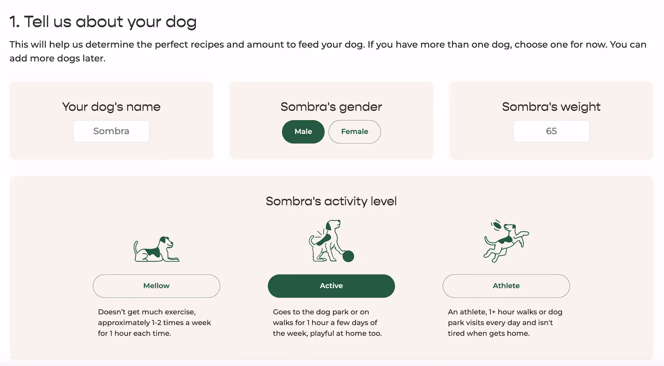 For a busy working pet parent, easy, mess-free serving is important. All four fresh brands deliver two weeks of food at a time and offer a meal plan builder based on breed, weight, activity level, and allergies. We put the same information in each – Breed (Husky), weight (65lbs), activity level (active), Weight (ideal), and Allergies (None).