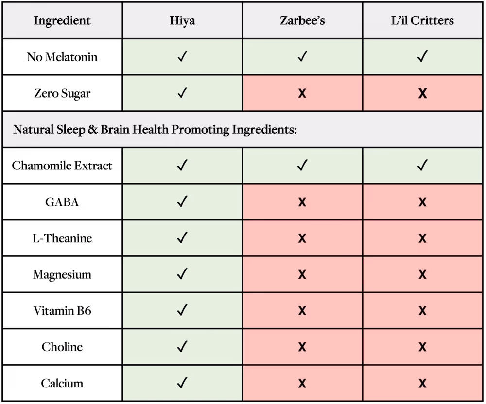 Looking at ingredients, there is no question that Hiya is the safest and most effective option for kids’ sleep aids.