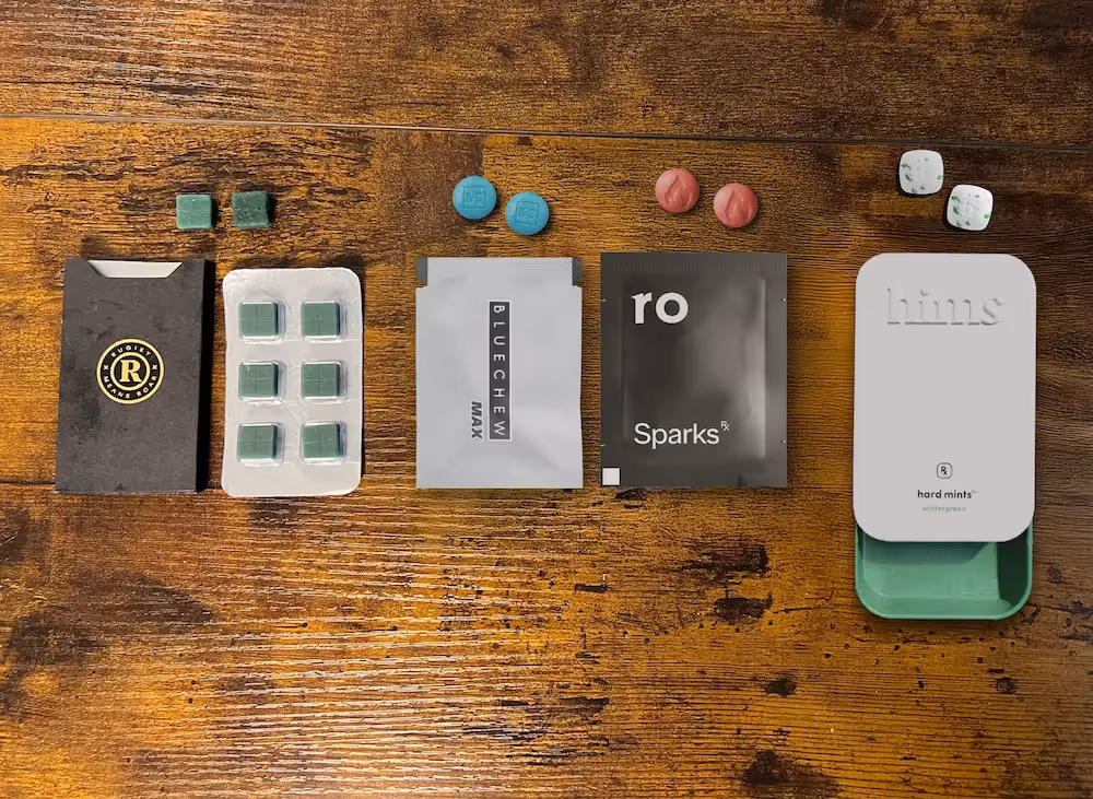 Ro Sparks is also sublingual - but is quite bitter and takes closer to 10 minutes to dissolve. BlueChew and Hims Hard Mints are chewable tablets, and much easier to spot. Taste for both (berry for BlueChew, mint for Hims) were tolerable, but tasted clearly medicinal.
