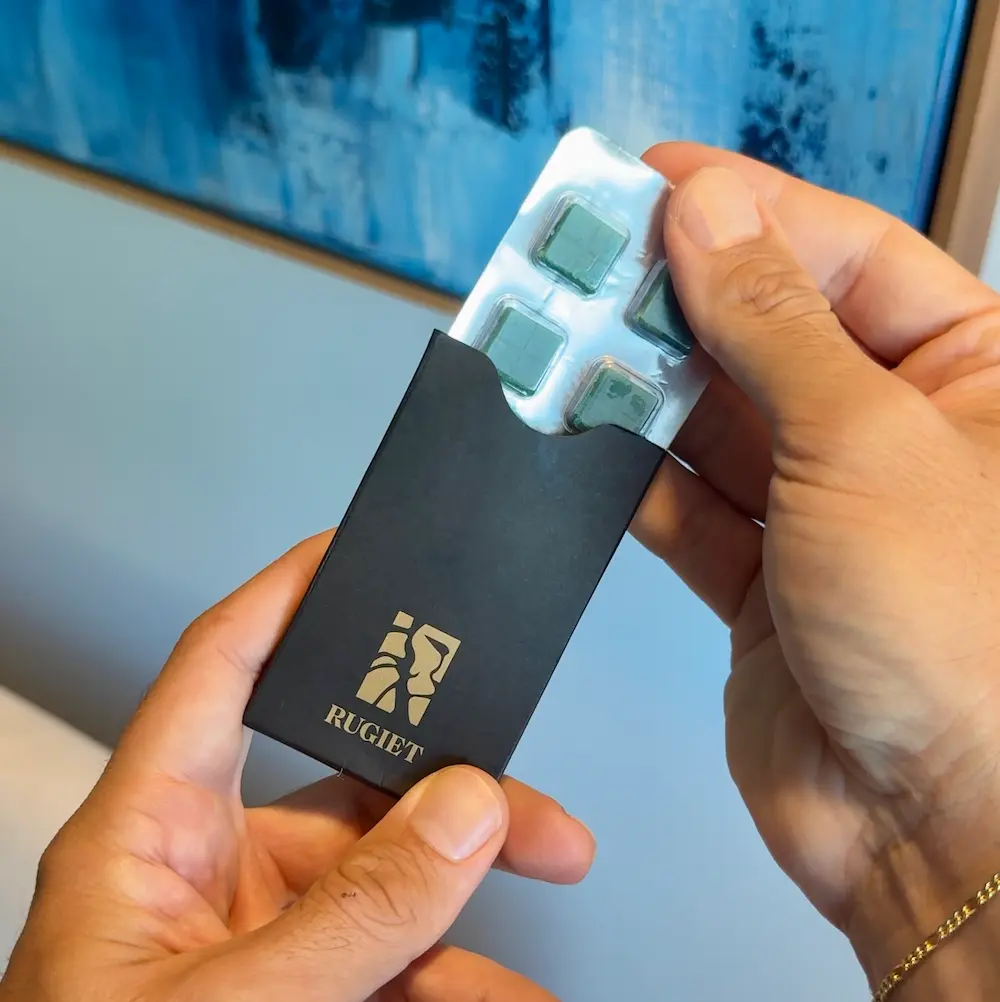 Rugiet Ready is entirely online - a licensed physician will review your medical intake form and prescribe the medication, no live visit required (except in special cases), and medication will be shipped to your door. Rugiet is a sublingual tablet that dissolves under the tongue in about 5 minutes - no water or interruption needed. It tastes like a breath mint and starts working in about 15 minutes.
