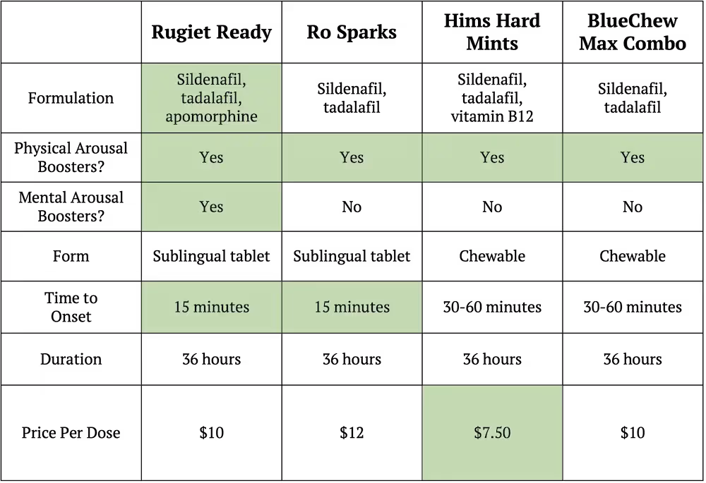 Now, let’s see how Rugiet, Ro, Hims, and BlueChew ED treatments compare.
