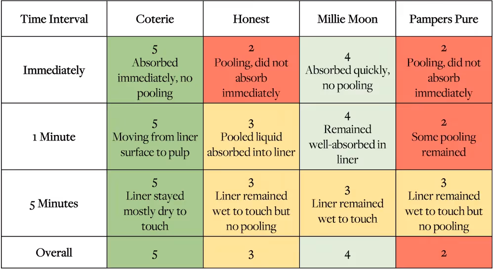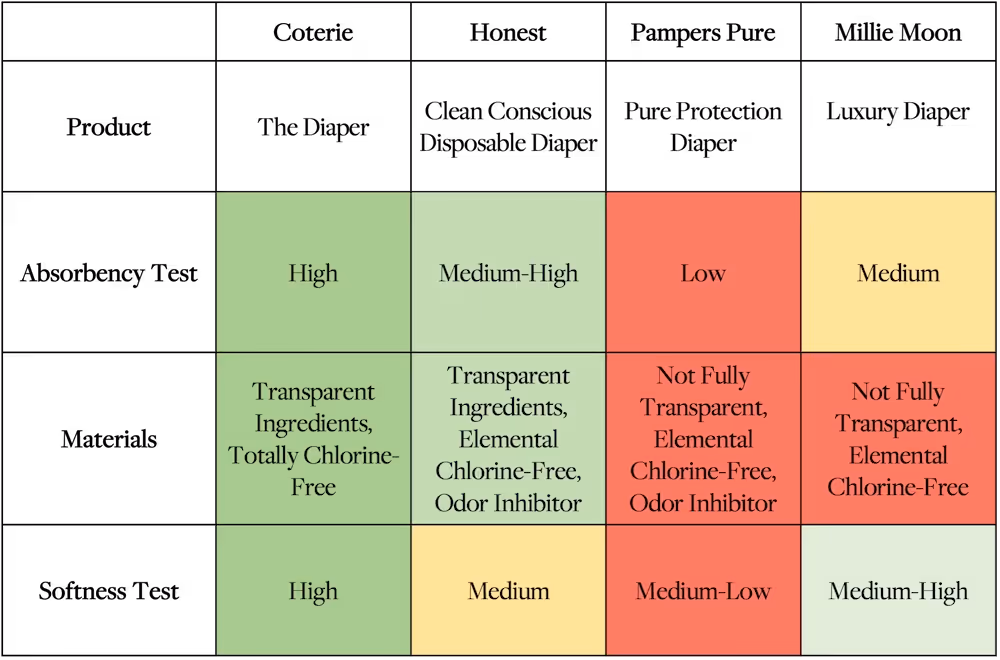 How Coterie, Honest, Millie Moon, and Pampers Pure compared in our test categories: