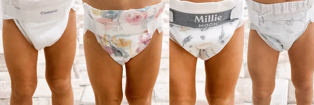 After testing these four diapers from Honest, Pampers Pure, Millie Moon, and Coterie, the winner is clear: Coterie. It was the most absorbent diaper (by far), the softest, contained no fragrances or lotions, and was the only to feature Totally Chlorine-Free (TCF) Pulp.