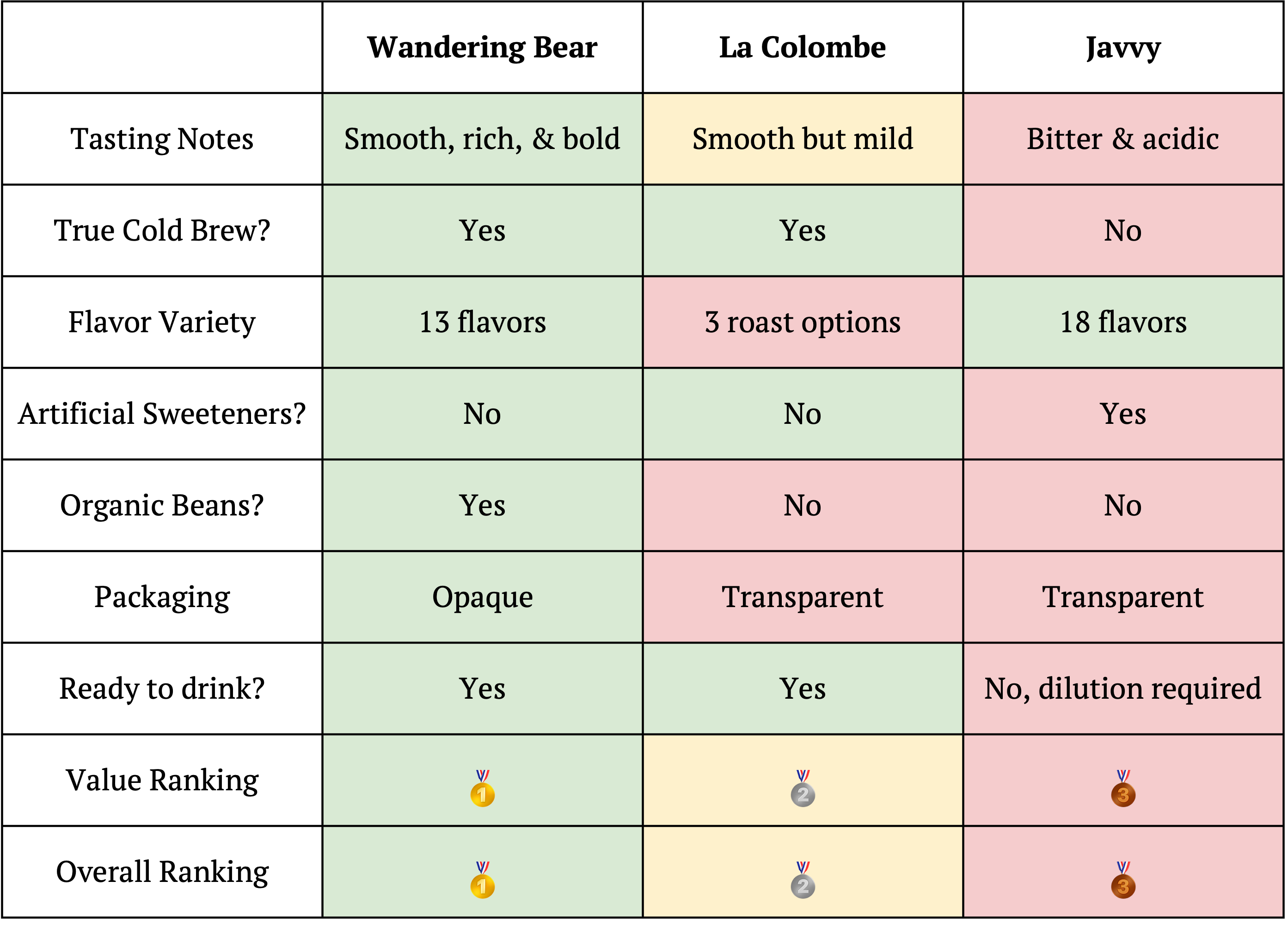 🥈 La Colombe takes second place with a smooth but too mild taste. Sarah described it as “Pretty good, not bitter or acidic,” but the overall flavor profile is noticeably lighter than Wandering Bear - “lacking richness and depth.” Like Wandering Bear, it is a true cold brew with a long, cold steep, but La Colombe uses lower-quality, non-Organic beans.