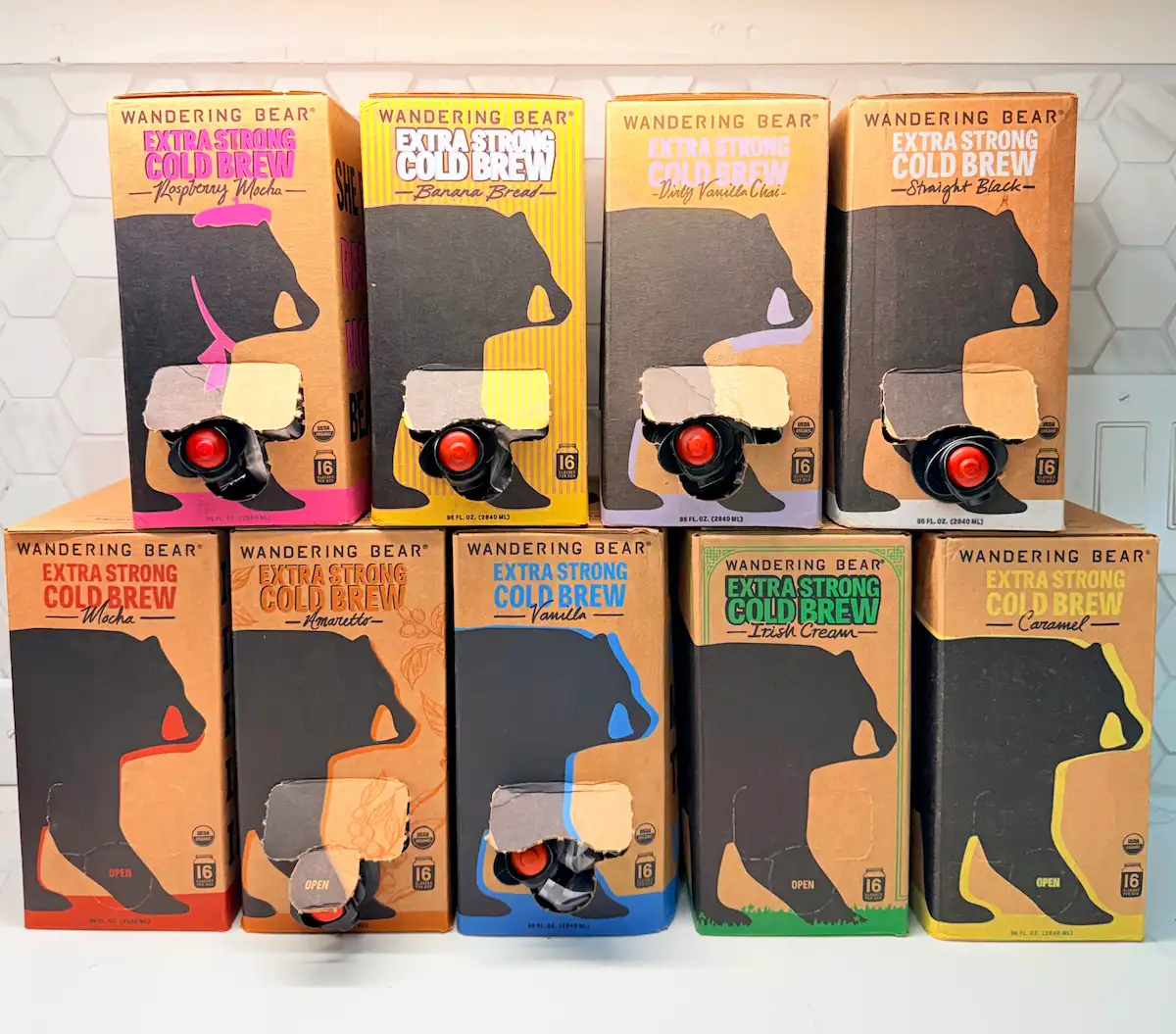 🥇 Wandering Bear uses recyclable boxed packaging to protect the cold brew from light and a bag-in-box format to prevent air from touching it until it’s poured, which keeps the coffee fresh. It can be safely stored at room temperature before opening and stays fresh in the fridge for 30 days once opened.