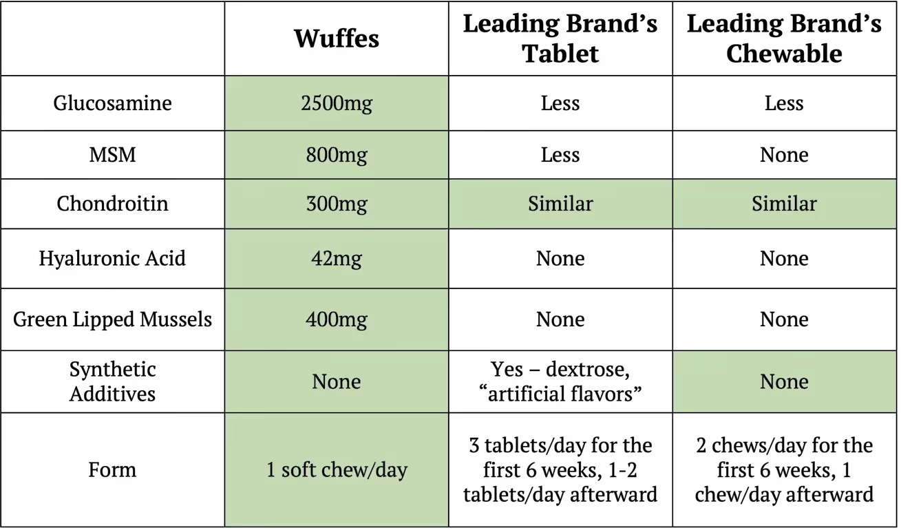 Wuffes is the only supplement that includes glucosamine, MSM, and chondroitin - plus it uses no byproducts or artificial flavors/fillers.