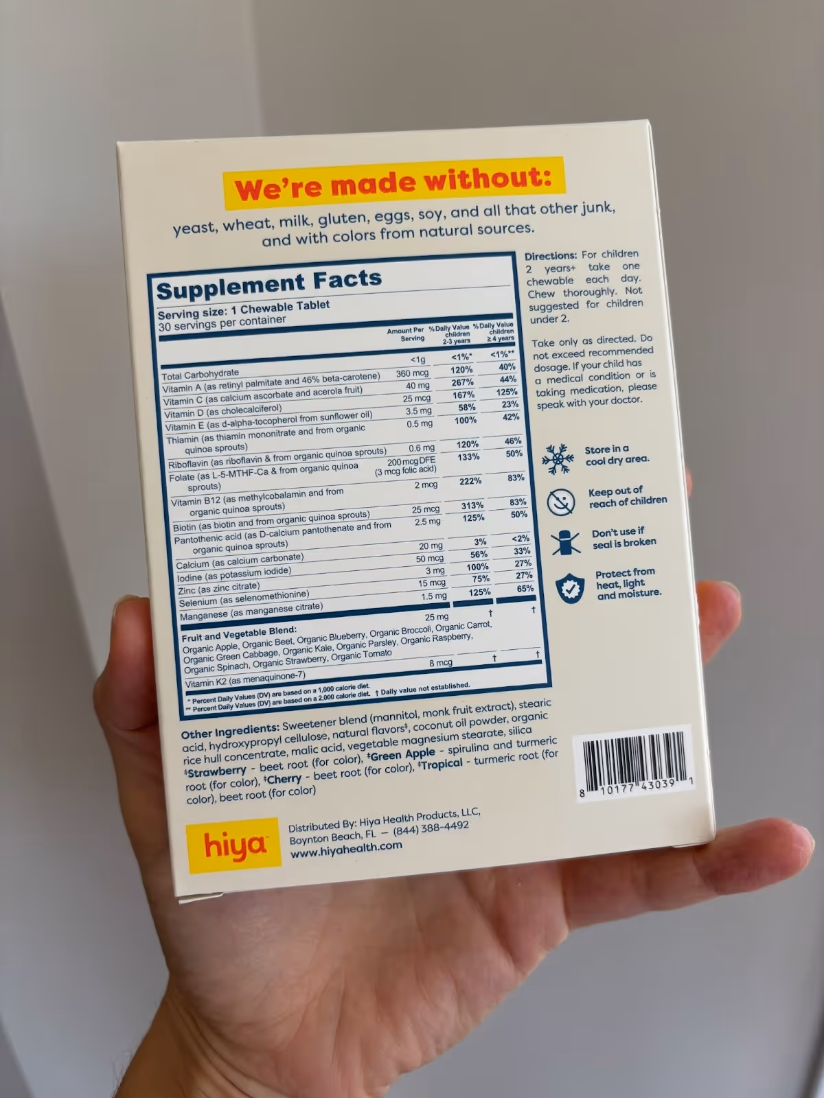 The clean brand our pediatric dietitian recommends is Hiya. Hiya is a safe, chewable, sugar-free tablet developed with pediatricians. Monk fruit and mannitol add mild sweetness that kids enjoy – without the sugar, syrups, or gummy residue. Each tablet delivers 15+ essential nutrients from real fruits and vegetables, supporting immunity, development, and energy. And unlike gummies, Hiya is safe for kids 2+.